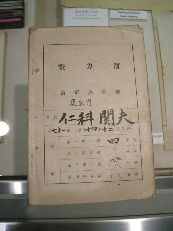 Photo 大津島回天記念館での仁科関夫関連資料の一部 「海軍兵学校体力簿」